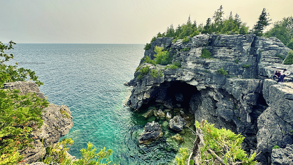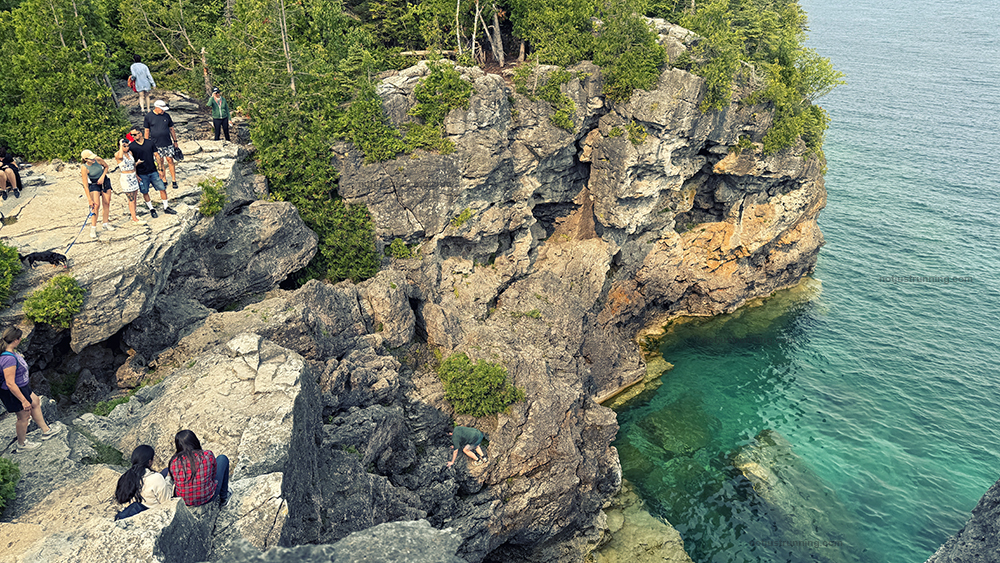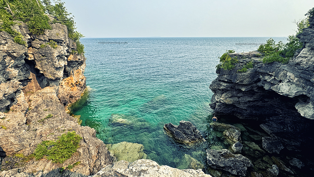 If you’ve never been, the Grotto is a natural sea cave carved into the limestone cliffs by centuries of wave action from Georgian Bay. In the morning light, the water shifts from deep sapphire to startling turquoise, so clear you can see every stone on the bottom. Indian Head Cove sits just east of the Grotto which is a sheltered, rocky bay with the same crystal-clear water, framed by dramatic cliff walls. It’s one of the most photographed spots in Ontario and in summer, one of the busiest.
