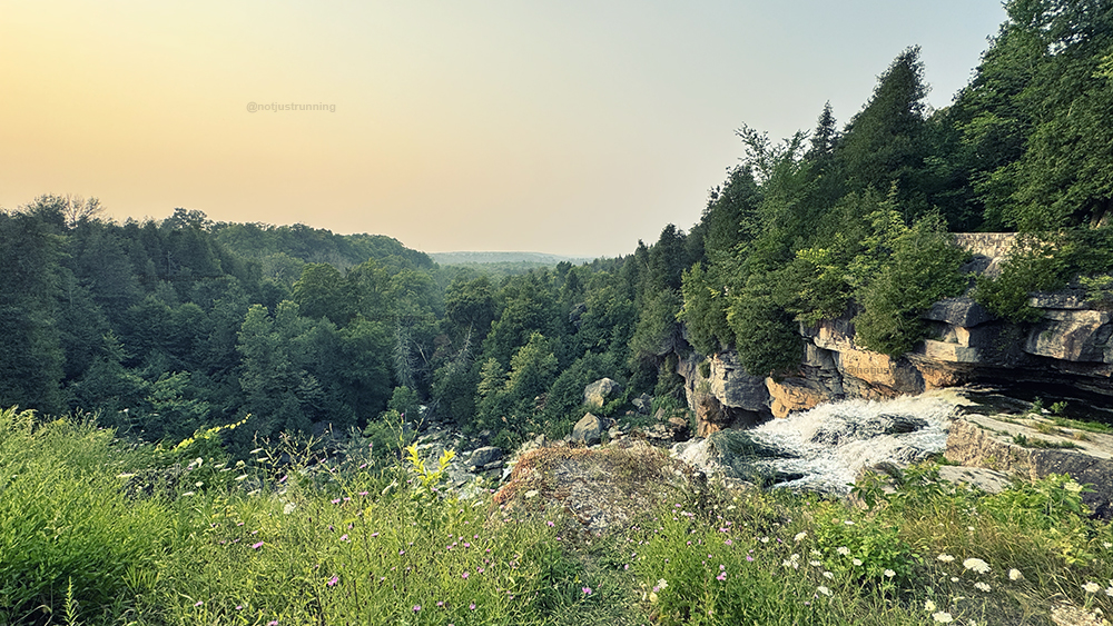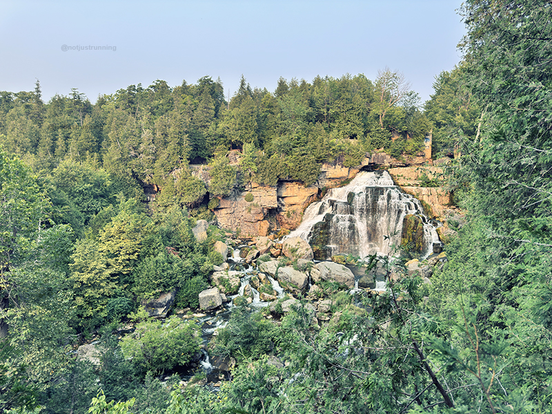 By early evening, we reached Owen Sound and checked into the Quality Inn. We barely dropped our bags before heading back out because daylight was slipping and we wanted to catch Inglis Falls before dark. The short drive out of town brought us to the conservation area, where we paid $10 for parking and followed the sound of rushing water. The falls roared over ancient limestone, framed by a lush green backdrop that smelled faintly of pine and wet stone. Standing there, we could feel the cool mist brushing our faces.